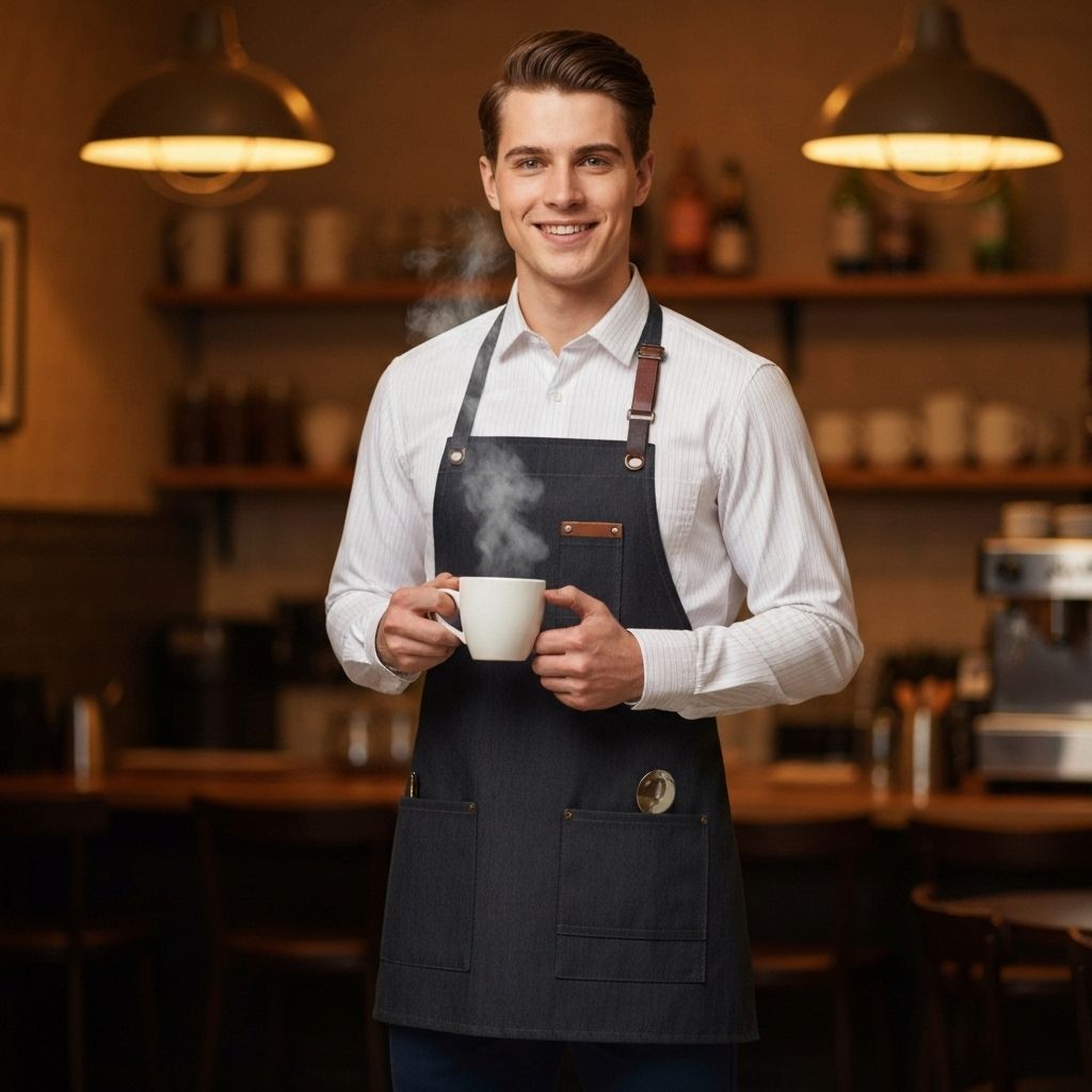 Apron berkualitas tinggi dengan desain ergonomis untuk barista profesional
